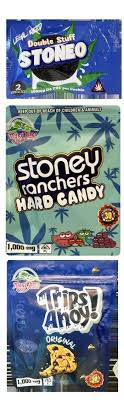 The "Trips Ahoy!" logo also mirrors the color scheme and font used for the Chips Ahoy! logo. Additionally, the packaging for other products like Stoney Patch Sour Watermelon Slices, Stoney Ranchers Hard Candy, Dank Ropes, and Flaming Hot Weedos have color schemes and design elements reminiscent of popular brands like Sour Patch Kids Watermelon Candy, Jolly Rancher hard candy, Nerds Rope, and Flamin’ Hot Cheetos.